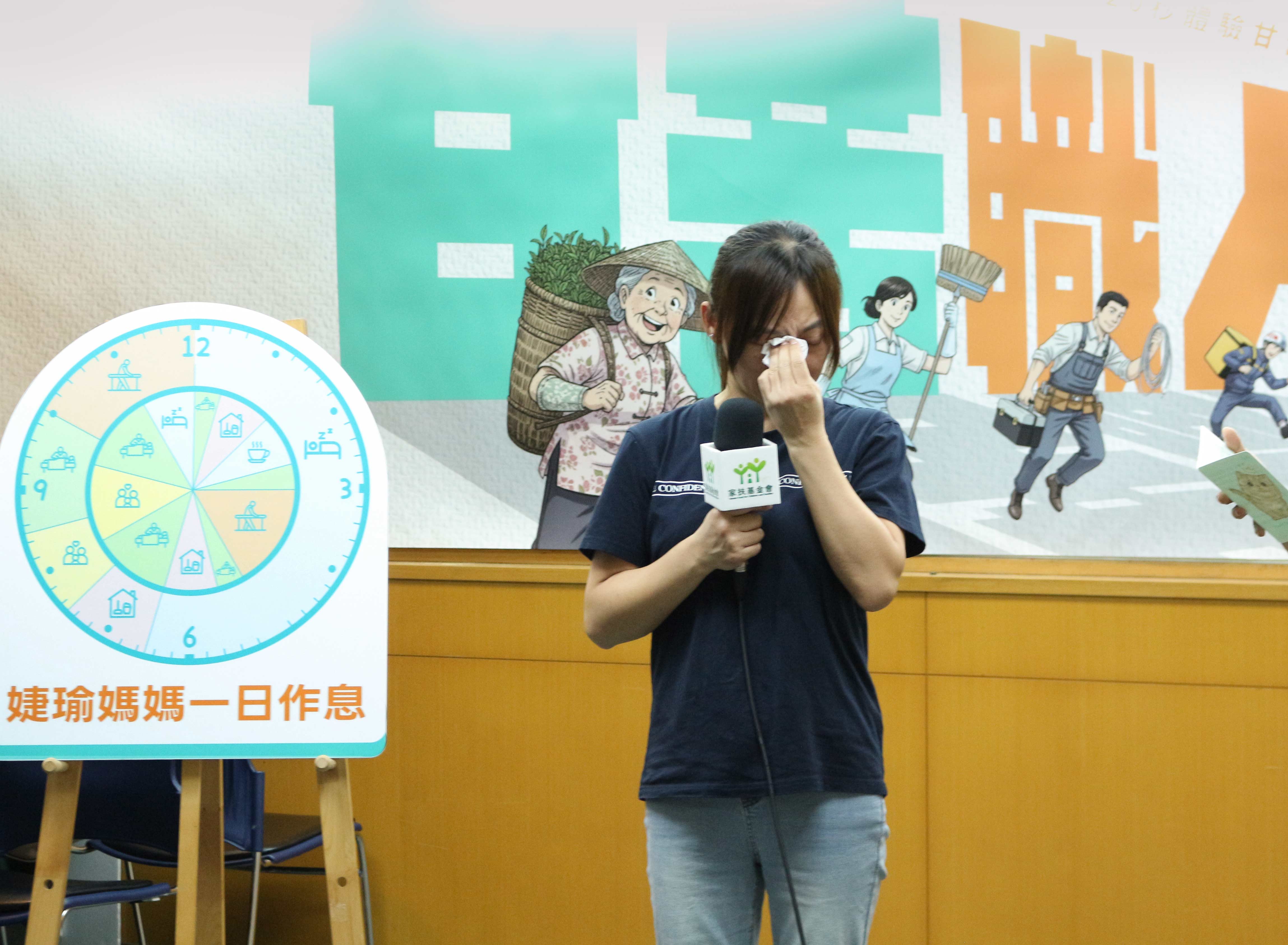 (中)端睿為了照顧生病家人及間傅養育子女的責任,選擇工時彈性高的工作,並利用零碎時間努力學習,今年初正式獲得公所清潔員工作