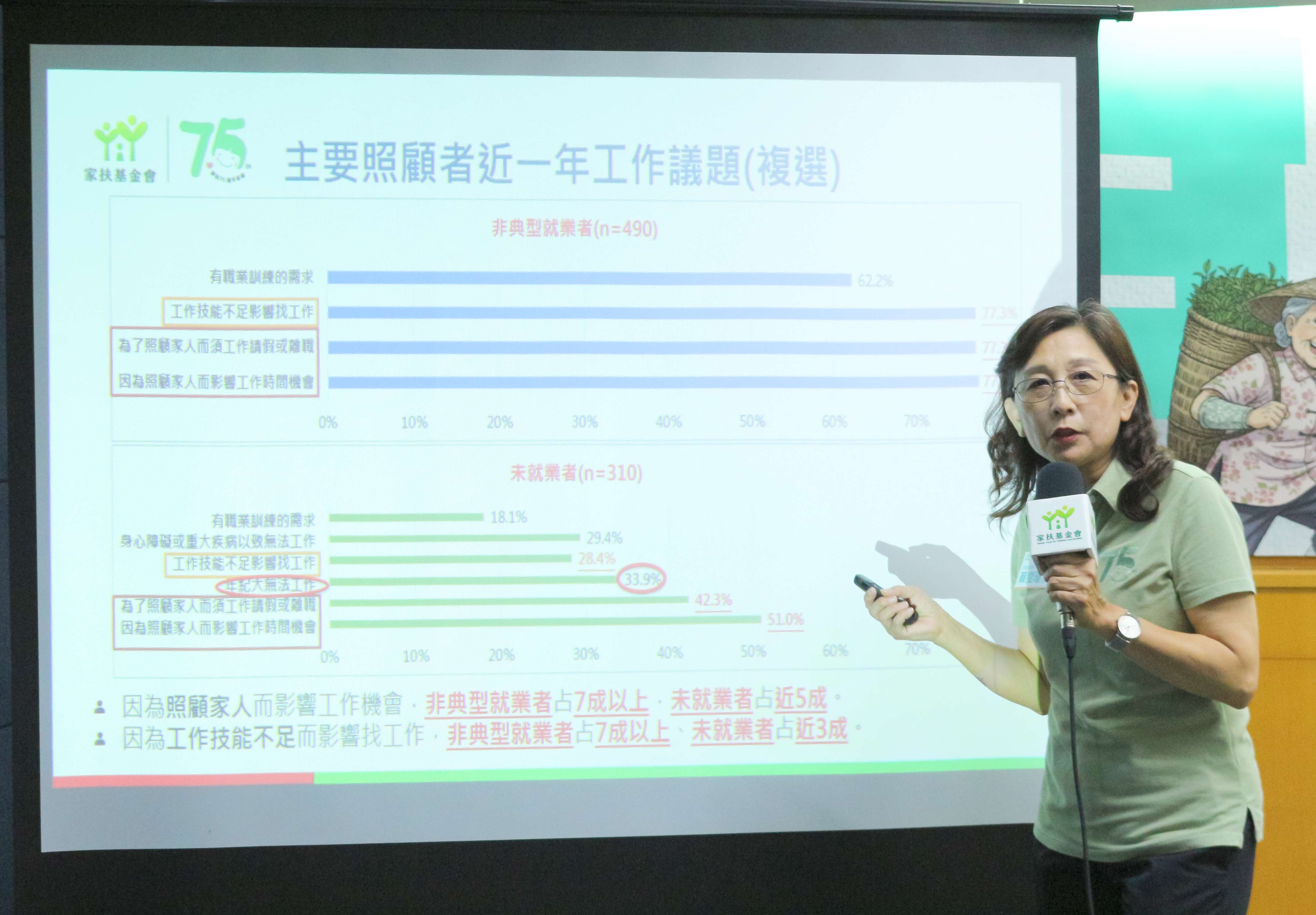 家扶基金會蔡雯瑾主任分享《無政府福利身分之扶助家庭生活狀況調查》,弱勢家庭多數就業曾遭遇家庭照顧、技能不足與疾病困擾三大難關